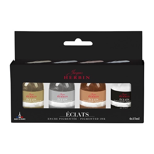 エルバンのドローイングインクコレクション「エクラ」。手軽に様々な色を楽しむことが出来るミニインクセットにピグメントインクセットが登場しました。 ピグメントインクで人気のメタリックカラーとホワイトを手軽に楽しむことができるセット。顔料ベースの不透明カラーは、黒などの濃い色の紙とあわせても鮮やかに発色し、表現の幅を広げます。【検索ハッシュタグ】#HERBIN#エルバン#インク#パリ#フランス#水彩#混色#画材