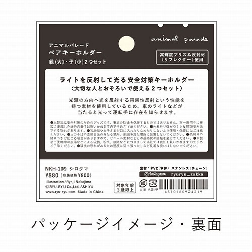 人気のペアキーホルダーに新デザインが登場。 新しいアニマルも仲間入りしました。 光源の方向へ光を反射する再帰性反射という性能を持つ素材(リフレクター)を使用しているため、 車のライトなどが当たると光って運転手に存在を知らせます。 アニマルの親子が1セットになっているので、 大切な人とおそろいで使えます。 ※本製品は安全対策のためのグッズです。事故の防止を保証するものではありません。