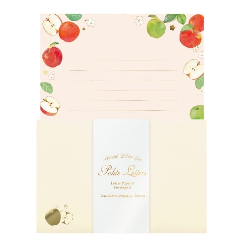 落ち着いたトーンのリンゴ柄に箔押しが施され、柔らかで上品なレターセット。