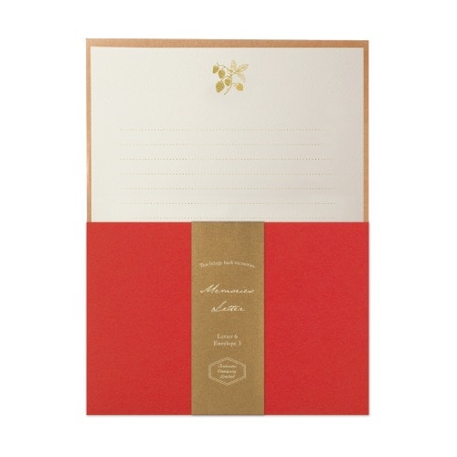 思い出や懐かしさを感じるモチーフとを繊細な箔押しで表現した、物語があるレターセットです。 旬ないちご柄に真っ赤な封筒が季節のお便りを彩ります。 【セット内容】便箋6枚+封筒3枚 【サイズ】(便箋)W150×H200mm・(封筒)W156×H105㎜【検索ハッシュタグ】#包む#レターセット#メモリーズ#イチゴ#いちご#ストロベリー#ワンポイント#箔押し#シンプル#赤色#淡色#レター#手紙