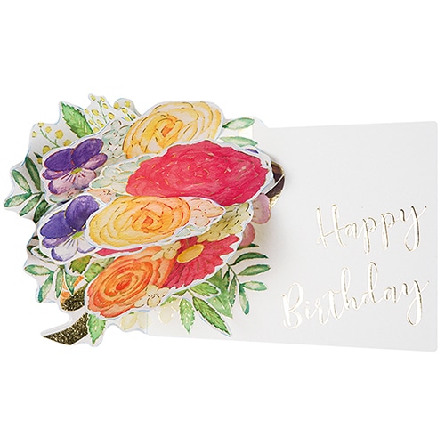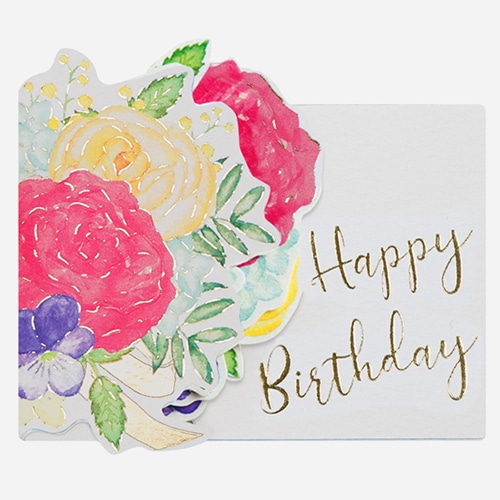 華やかなブーケがポップアップするバースデーミニカード。裏面メッセージ欄。「Happy Birthday」の文字。封筒色:グレー ※ミニカードのため郵送できません