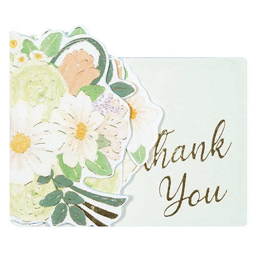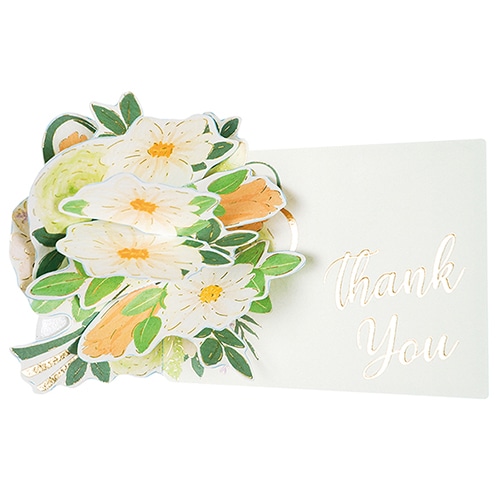 華やかなブーケがポップアップするサンキューミニカード。裏面メッセージ欄。「Thank You」の文字。封筒色:グレー ※ミニカードのため郵送できません