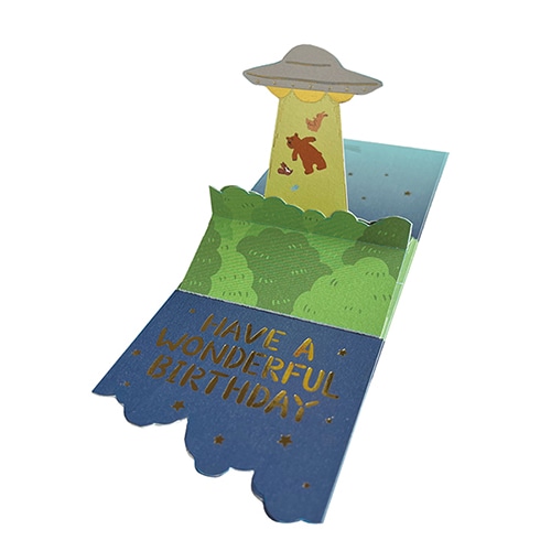 カードを広げると、未確認生物のUFOが森の動物たちをアブダクションしている様子が描かれたミニポップアップのバースデーカード
