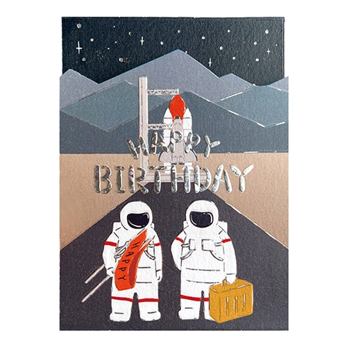 カードを広げると、宇宙にむかってロケットが出発する様子が描かれたバースデーミニポップアップカード。宇宙旅行を味わえるユニークなカードです。裏面のメッセージ欄では、宇宙飛行士たちが月に到着したようです。中面文字:「Have a Stellar Birthday」ミニカード(郵送不可)・封筒色(ブラウン)
