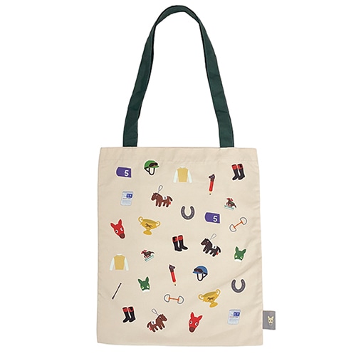 KEIBA柄のイラストが目を引く大判トートバッグ。裏表で異なるデザイン、カラーが楽しめます。内側にはポケット付。持ち手サイズ:W25×L620mm