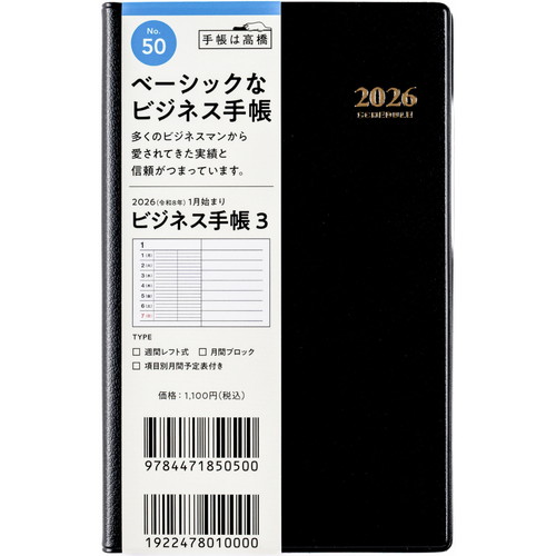 #高橋書店(日本国内のみ) 手帳 2026年 ウィークリー ビジネス手帳 3 黒 No.50 (2025年 12月始まり)