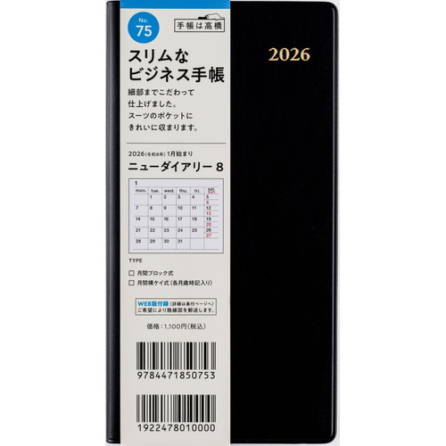 #高橋書店(日本国内のみ) 手帳 2026年 マンスリー ニューダイアリー 8 黒 No.75 (2025年 12月始まり)