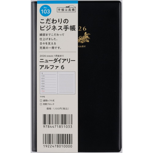 #高橋書店(日本国内のみ) 手帳 2026年 ウィークリー ニューダイアリー アルファ 6 黒 No.103 (2025年 12月始まり)