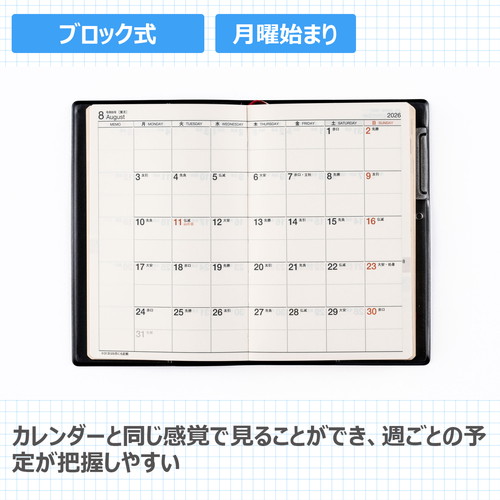 多くのビジネスマンに愛されてきた「高橋の定番ビジネス手帳」シリーズスーツの内ポケットに入ってもかさばらない、高橋書店の手帳の中で最小サイズ。