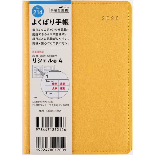 #高橋書店(日本国内のみ) 手帳 2026年 A6 ウィークリー リシェル 4 サンフラワーイエロー No.214 (2026年 1月始まり)