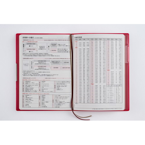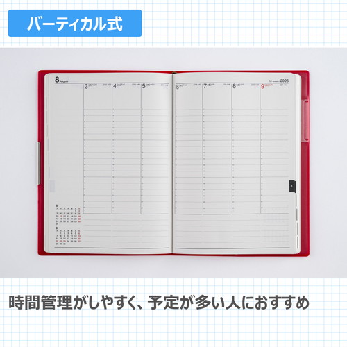 手帳ヘビーユーザーのあなたへ手帳を開くことの多い方にもうれしい、補強も兼ねたヘリ留め金具付きのカバーデザイン。記入欄の広さと携帯性を兼ね備えた一冊です。