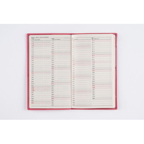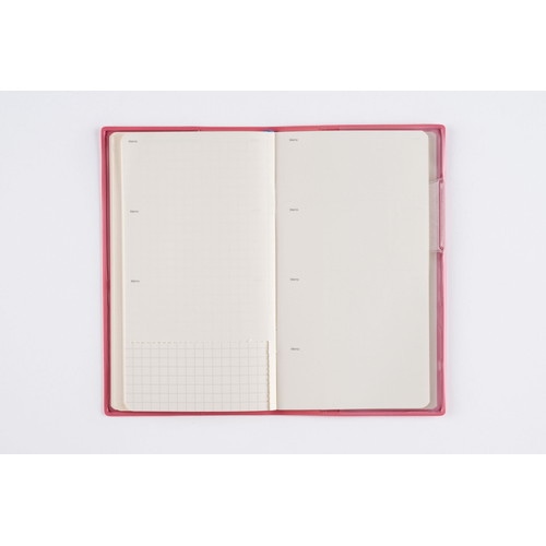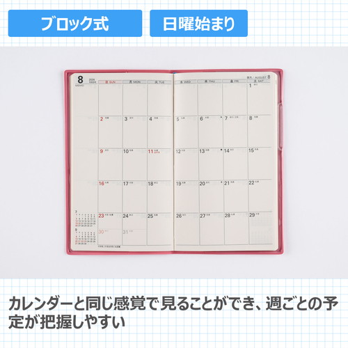 「見開き1ヵ月+メモ」のシンプルさが人気!カレンダーと同じで見やすい日曜始まり、土日均等タイプです。