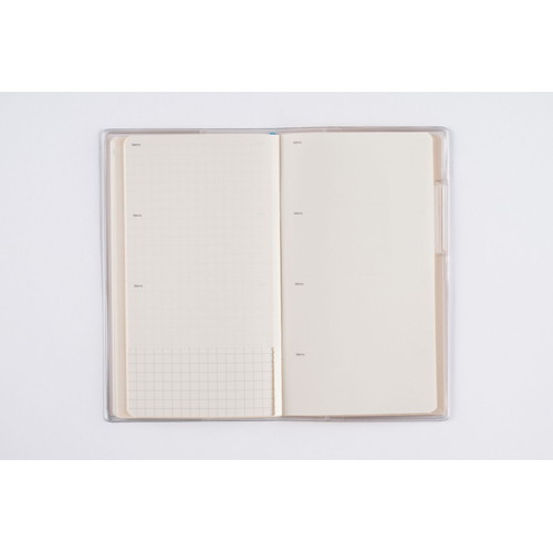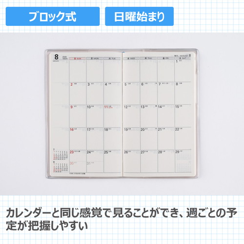 「見開き1ヵ月+メモ」のシンプルさが人気!カレンダーと同じで見やすい日曜始まり、土日均等タイプです。