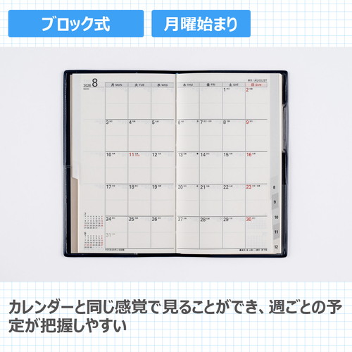 「見開き1ヵ月+メモ」のシンプルさが人気!「薄さ」と「軽さ」が人気の土日均等タイプ。一冊目にはもちろん、趣味やプライベートなどサブ手帳としてもオススメです。