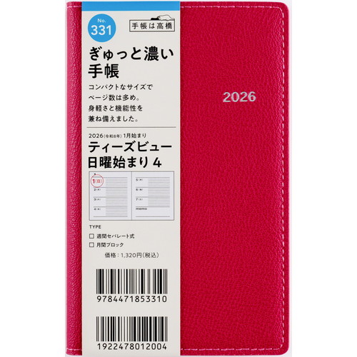 #高橋書店(日本国内のみ) 手帳 2026年 ウィークリー ティーズビュー 4 ストロベリーレッド No.331 (2025年 12月始まり)