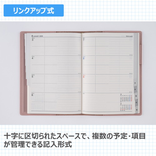 高橋書店で一番人気のB6判シリーズ。高級感あふれる、シックなカバーデザインは、ビジネスシーンはもちろん、プライベートでも違和感なく持ち歩けます。女性に人気の柔らかなベージュカラーです。