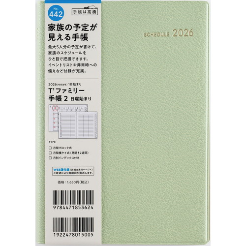 #高橋書店(日本国内のみ) 手帳 2026年 B6 マンスリー ティーズファミリー 2 リュクスハーブグリーン No.442 (2026年 1月始まり)