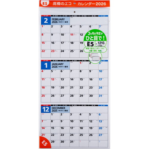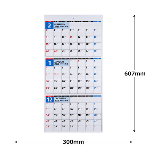 便利な3ヵ月一覧型のカレンダーです。先々の予定まで管理できる優れものです。常に3ヵ月分が一覧できるので、予定の先行管理がしやすいカレンダー。切り取り線入りで、使用後の保管も可能。【本体サイズ】607×300(mm)【曜日始まり】日曜始まり【記入形式】表面:ブロック式