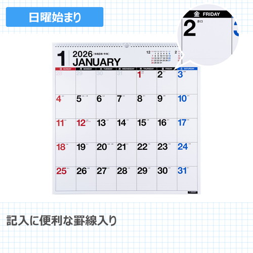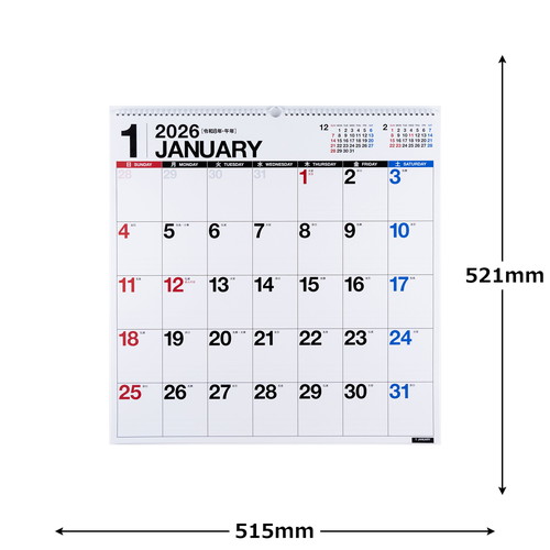 ご自宅でもオフィスでも重宝する、見やすさ・書きやすさNo.1の大判カレンダー。洗練されたスクエアタイプ。【本体サイズ】521×515(mm)【曜日始まり】日曜始まり【記入形式】表面:ブロック式