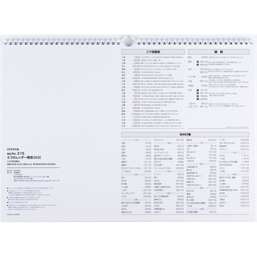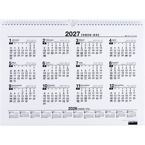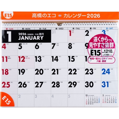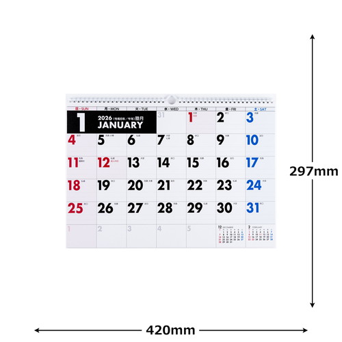 文字が太く、土日祝日に色が付いているので、見やすさ抜群。遠くからでも日付と曜日がはっきり分かります。【本体サイズ】297×420(mm)【曜日始まり】日曜始まり【記入形式】表面:ブロック式