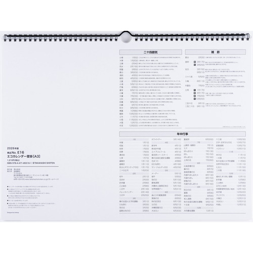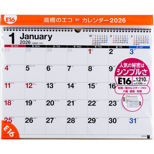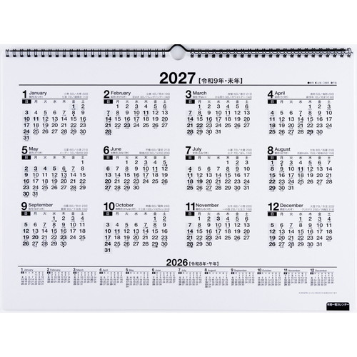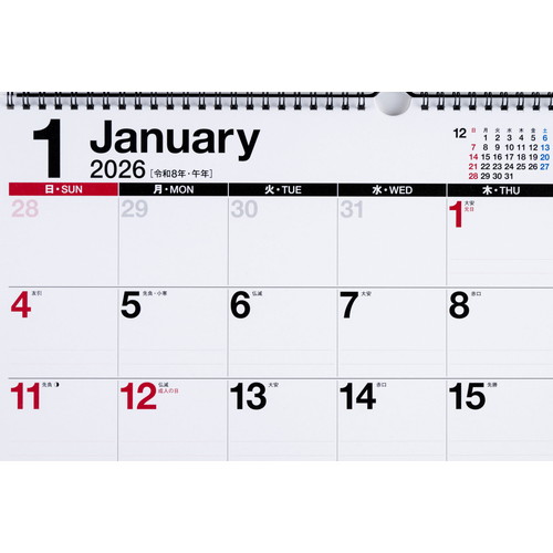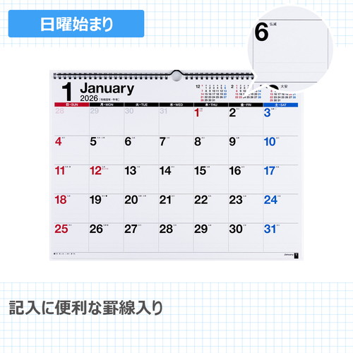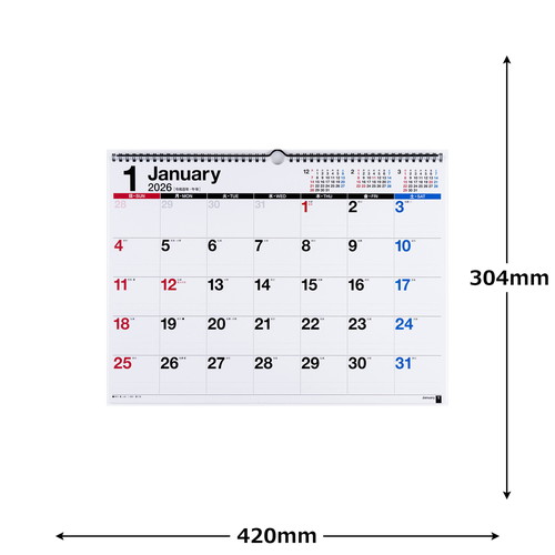 シンプルで、どんな場所にもなじむデザインです。1日のマスに2本の罫線が引かれているので、家族や予定ごとに書き分けられます。右上には前月・次月・次々月のミニカレンダー付きで、先々の予定の確認もばっちり。【本体サイズ】304×420(mm)【曜日始まり】日曜始まり【記入形式】表面:ブロック式