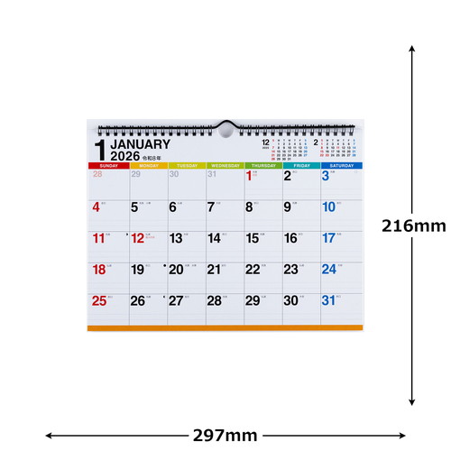 ポップな色使いの機能的なカレンダーです。1日のマスに2本の罫線が引かれているので、家族や予定ごとに書き分けられます。右上には前月・次月のミニカレンダー付きで、先々の予定の確認もばっちり。【本体サイズ】216×297(mm)【曜日始まり】日曜始まり【記入形式】表面:ブロック式