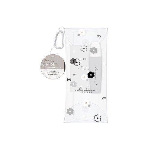 プレゼントにぴったり!カラビナ付きのクリアポーチに蛍光ペンとミニメモが入ったステーショナリーギフトセットです!自分用にもお友達にもカジュアルに使えるデザインです!