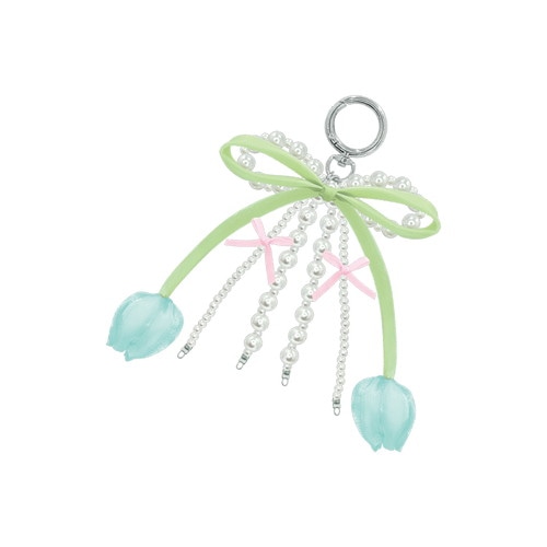 大小のリボンがゆらゆらかわいい!パール素材のチューリップとちびリボンが注目度抜群のキーホルダーです!カバンに付けても目立ってかわいい!