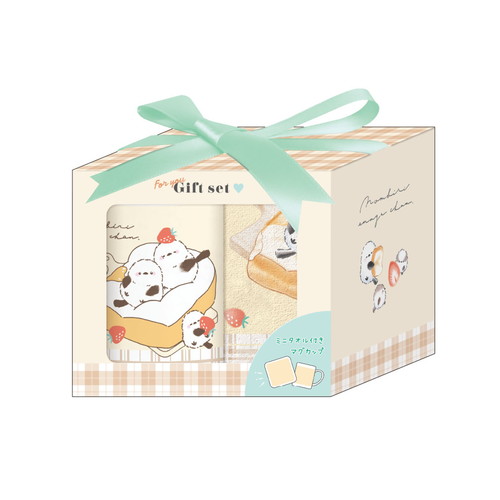 ギフトにぴったり!リボンが付いたタオルとセットのマグカップが人気のデザインで登場です!フルカラー印刷の可愛いタオルとたっぷり入り大きめマグカップ入り!箱は窓あき仕様でプレゼントしやすいパッケージです!