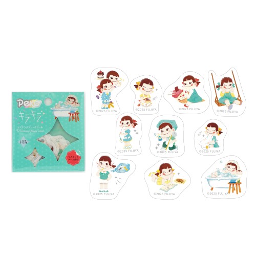 ペコちゃんとキラキラシリーズがコラボレーションしたフレークシールです!おしゃれにお着替えしたペコちゃんたちのデザインが揃いました。
