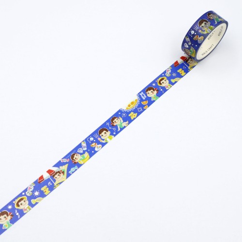 ペコちゃんとキラキラがコラボレーションしたマスキングテープです。仕様は幅15㎜×長さ5mでレインボーオーロラ箔を使用しました。手帳やノートなどのデコレーションにぴったりです。