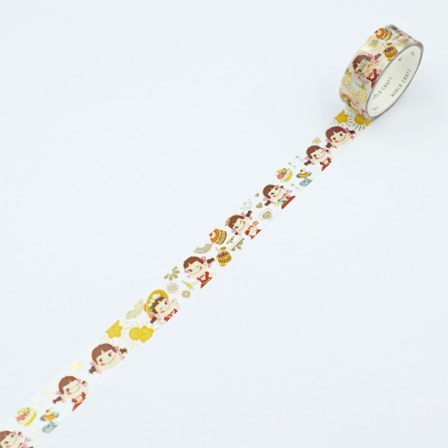 ペコちゃんとキラキラがコラボレーションしたマスキングテープです。仕様は幅15㎜×長さ5mでゴールド箔を使用しました。手帳やノートなどのデコレーションにぴったりです。