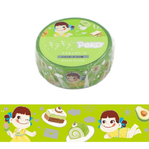 ペコちゃんとキラキラがコラボレーションしたマスキングテープです。仕様は幅15㎜×長さ5mでレインボーオーロラ箔を使用しました。手帳やノートなどのデコレーションにぴったりです。