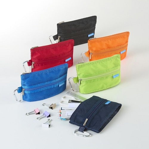 最大マチ幅5cmまで広がる持ち運びに便利なミニサイズです。表面がメッシュ仕様になっており、軽量で通気性も抜群です。おしゃれなセンタージップで、開閉もスムーズ。中身が見やすく、必要なものをすぐに取り出せます。カラビナ付きで、バッグやベルトループに簡単に取り付けられ、外出時でも安心です。ペンケースやガジェットケースとしてはもちろん、メイクポーチとしても大容量を活かして活用いただけます。