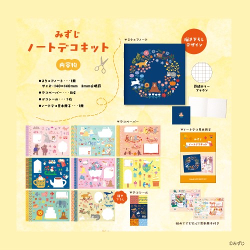 人気クリエイターのイラストがたっぷり!シール、ノート、デコレーションペーパー8枚、冊子の4点セット入った、豪華なノートデコキット。【検索ハッシュタグ】#ノート#ノートデコ#手帳#手帳デコ#クリエイター#デコレーション#みずじ