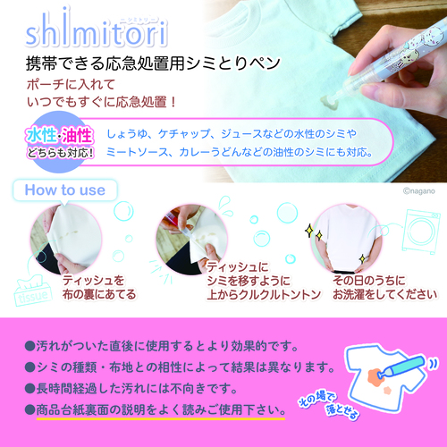 しみとりにちいかわ第二弾が登場しました!持ち運びに便利なペン型の衣類用しみとり剤です。油性・水性どちらのシミにも対応しています。