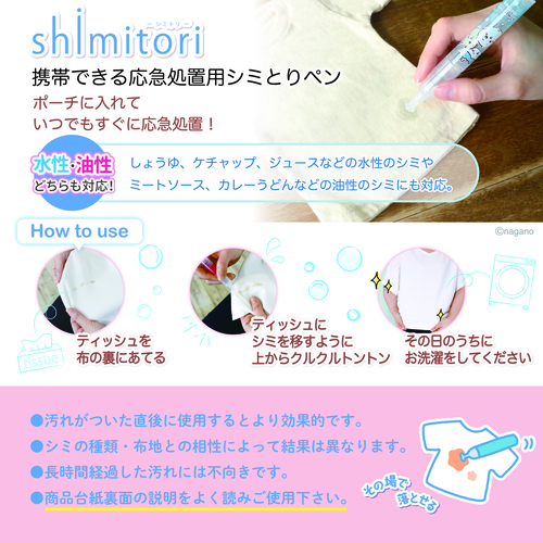 持ち運びに便利なペン型のしみとり剤です。携帯用なのでサッと取り出して、パパっと応急処置が可能です。【こんなシミに】醤油、ミートソース、ファンデーション、口紅etc