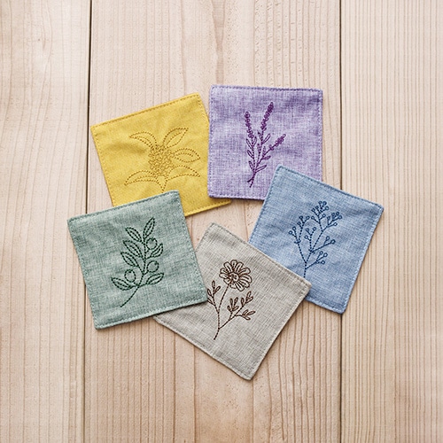 リネン風の生地に植物柄の刺繍を施したコースター。