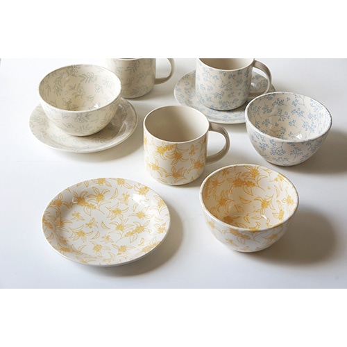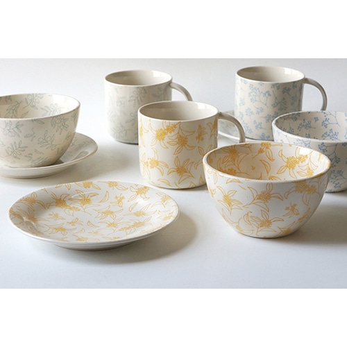 温かみのあるオフホワイトのベース色に、落ち着いた色合いの植物柄のデザイン。ボウルは内側にも絵柄を施しました。おもてなしにも普段使いにも。テーブルがぱっと華やぎます。