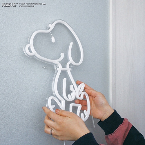 スヌーピーやウッドストックがかわいく光るLEDネオン調ライト。明るさを調整できるので気分に合わせて楽しめます。壁掛けと卓上の2WAY仕様。壁掛け穴サイズ:直径9mm/卓上用スタンド付属/USBケーブル:長さ2m(アダプターは付属しません)/明るさ調整10段階の調光スイッチ付き/屋内専用/個箱入り