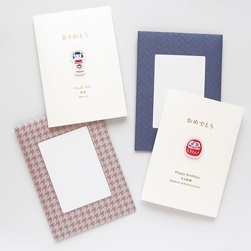 日本の代表的なモチーフや民芸品をアクリルパーツで表現したグリーティングカード。封筒は日本の伝統模様です。それぞれ英語、中国語、フランス語のメッセージが入っているので海外の方へのお土産やプレゼントにもおすすめです。