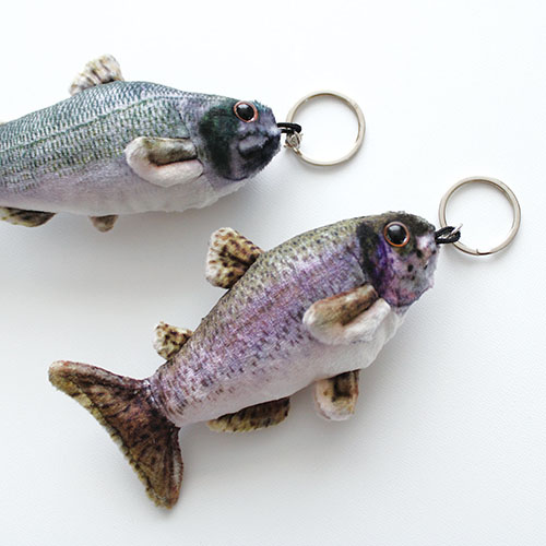 ふわふわ生地にリアルな魚のプリントを施した、ちょっとシュールなぬいぐるみキーチェーン。