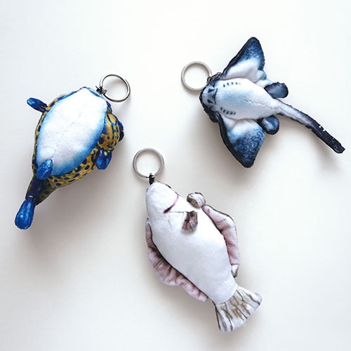 ふわふわ生地にリアルな魚のプリントを施した、ちょっとシュールなぬいぐるみキーチェーン。