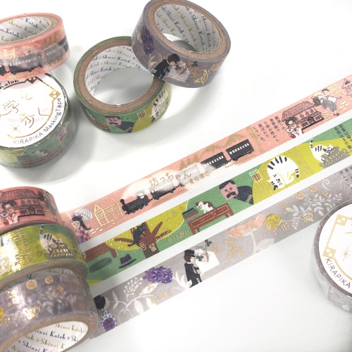 Shinzi Katohが名作文学の世界を色彩豊かに描く「文学を歩く」シリーズのきらぴかマスキングテープ第四弾です。ゴールドホログラム箔をふんだんに使用したデザインです。