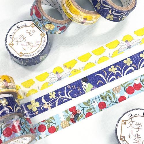Shinzi Katohが名作文学の世界を色彩豊かに描く「文学を歩く」シリーズのきらぴかマスキングテープ第四弾です。ゴールドホログラム箔をふんだんに使用したデザインです。