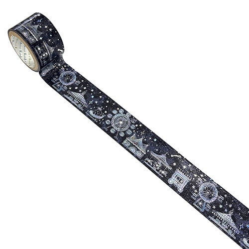 繊細な絵柄にホログラム箔を添えたワイド幅(27mm幅)の箔押しマスキングテープ。絵柄に合わせてゴールドとシルバー、2種の箔を使用されており、ワイド幅ならではの華やかさが、イラストレーターShinziKatohが描いた世界観を豊かに広げます。【検索ハッシュタグ】#マステ#幅広#遊園地#メリーゴーランド#観覧車#大人向け#箔押し#キラキラ#黒#washitape#デコレーション#コラージュ#手帳#ノート#可愛い#動物#文学#文具女子#剥がせる#