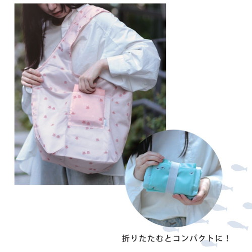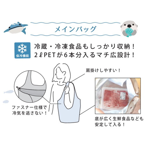 サブバッグ付きでたくさん買い物しても安心な2個セットのエコバッグ。メインのエコバッグは、夏場のお買い物でも安心な保冷仕様。夏をイメージさせる水族館の生き物たちをモチーフに。