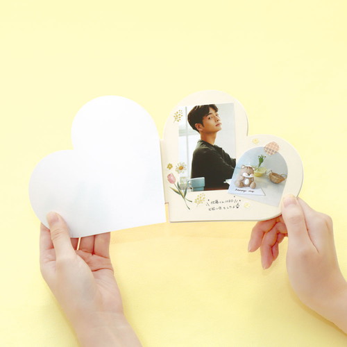 ハートとウェーブのダイカットの仕様。カラー台紙も4枚付きでオリジナルのデコ仕様が出来ます。パッケージのジップ付パッケージに入れたいモノを入れ、ギフトとしても◎。