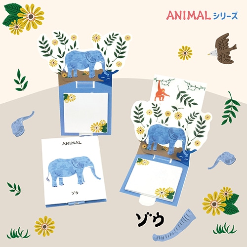 開くと"ゾウ"が飛び出すしかけつきふせん。 付箋は花・植物デザインになっており、仕事場でも日常でも使いやすいデザインで、使わない時も飾って楽しめるかわいさと遊び心が詰まった商品です。