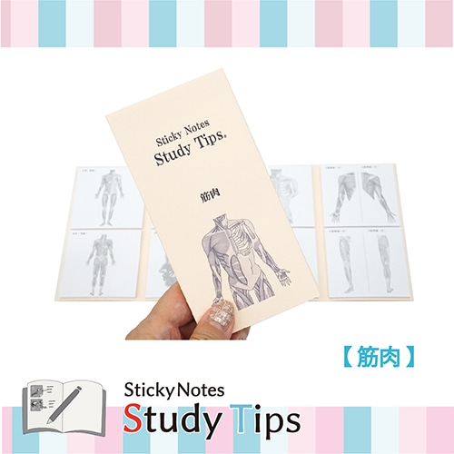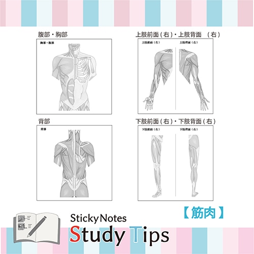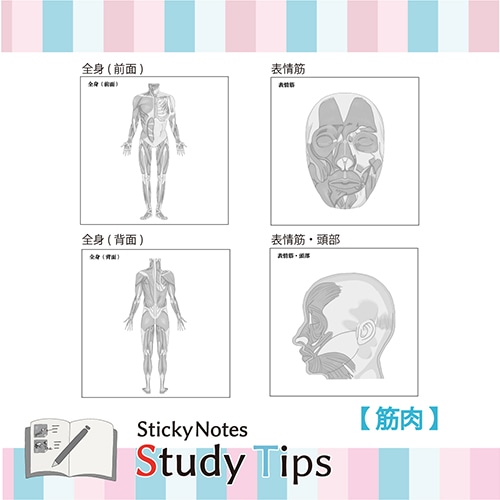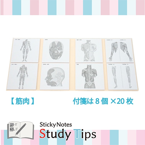 現役医師監修! 勉強するときに面倒な図の書き写し…。そんな時間を解消するために開発された筋肉付箋です。 蛍光ペンや色ペンなどを自由に使って効率的に学ぶことができるシンプルなデザインです。また書き込むことは学習効果を高め、より記憶に残りやすいとされています。 畳むとコンパクトになるので、持ち歩くのにも適しています。 付箋は20枚つづりになっており、繰り返しの復習するにもお友達におすそ分けするにも便利です。 スタイリッシュな外観は、いつでもサッと取り出して使うことができ、かっこよさも演出します。 ノートや壁に貼って使えます。 【筋肉】「全身(前面)」「全身(背面)」「表情筋」「表情筋・頭部」「胸部・腹部」「背部」「上肢前面・背面」「下肢前面・背面」全8柄【検索ハッシュタグ】#人体#筋肉#Sticky Notes Study Tips#スタディチップス#スタチプ#筋肉#からだのつくり#解剖生理学#理科#生物#医学#受験#勉強#筋トレ#筋肉痛#全身#表情筋#胸部#腹部#背部#上肢#下肢#医学生#病院#看護#ノート#実用的#便利#付箋#ふせん#メモ#塾#20枚綴り×8種類#紙季彩々#しきさいさい
